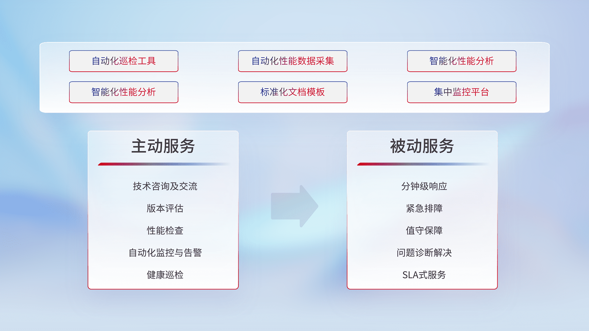 智能化工具和标准化文档,,,,保障服务质量,,,,提供主动服务(包含技术咨询、、、版本评估、、、、性能检查、、、、自动化监控与告警、、、、健康巡检)和被动服务包含(分钟级响应、、、紧急排障、、值守保障、、、、问题诊断解决、、SLA服务)。。。。